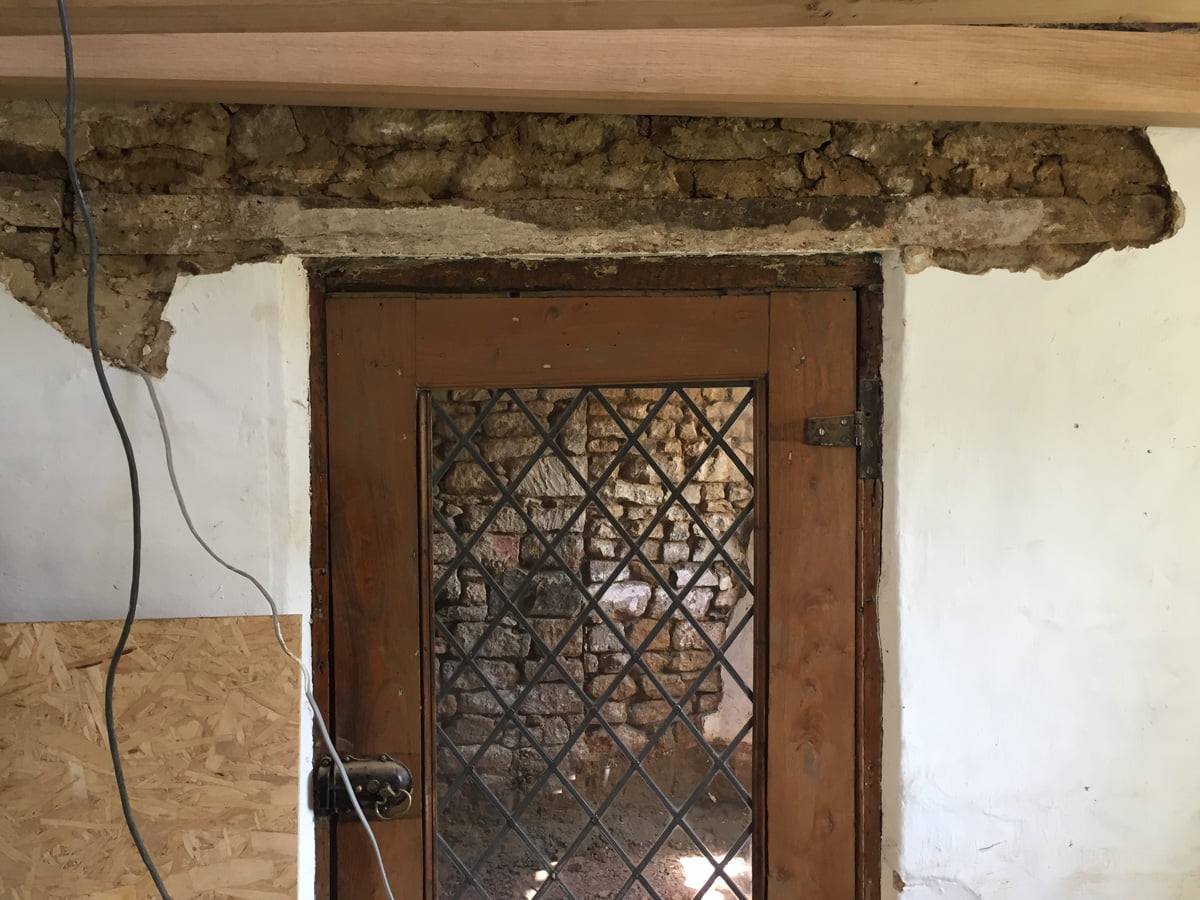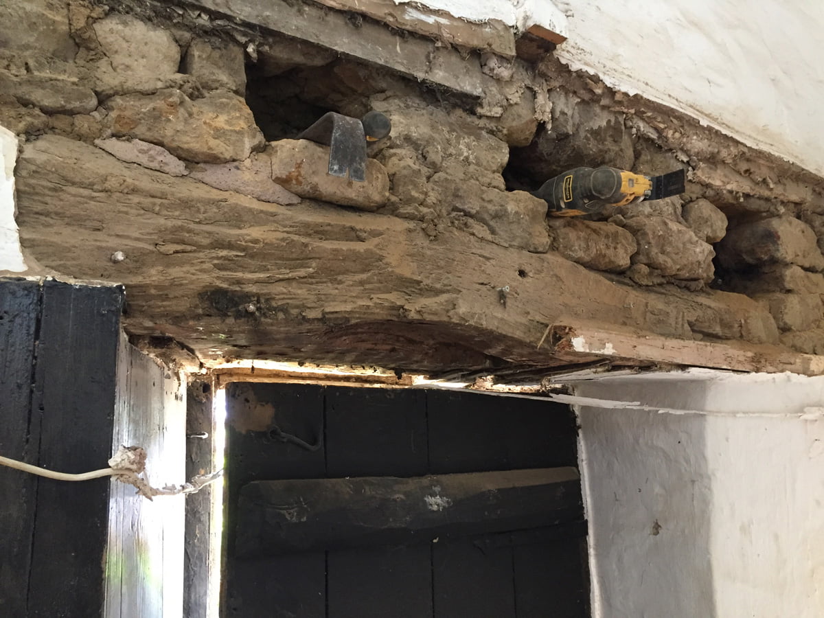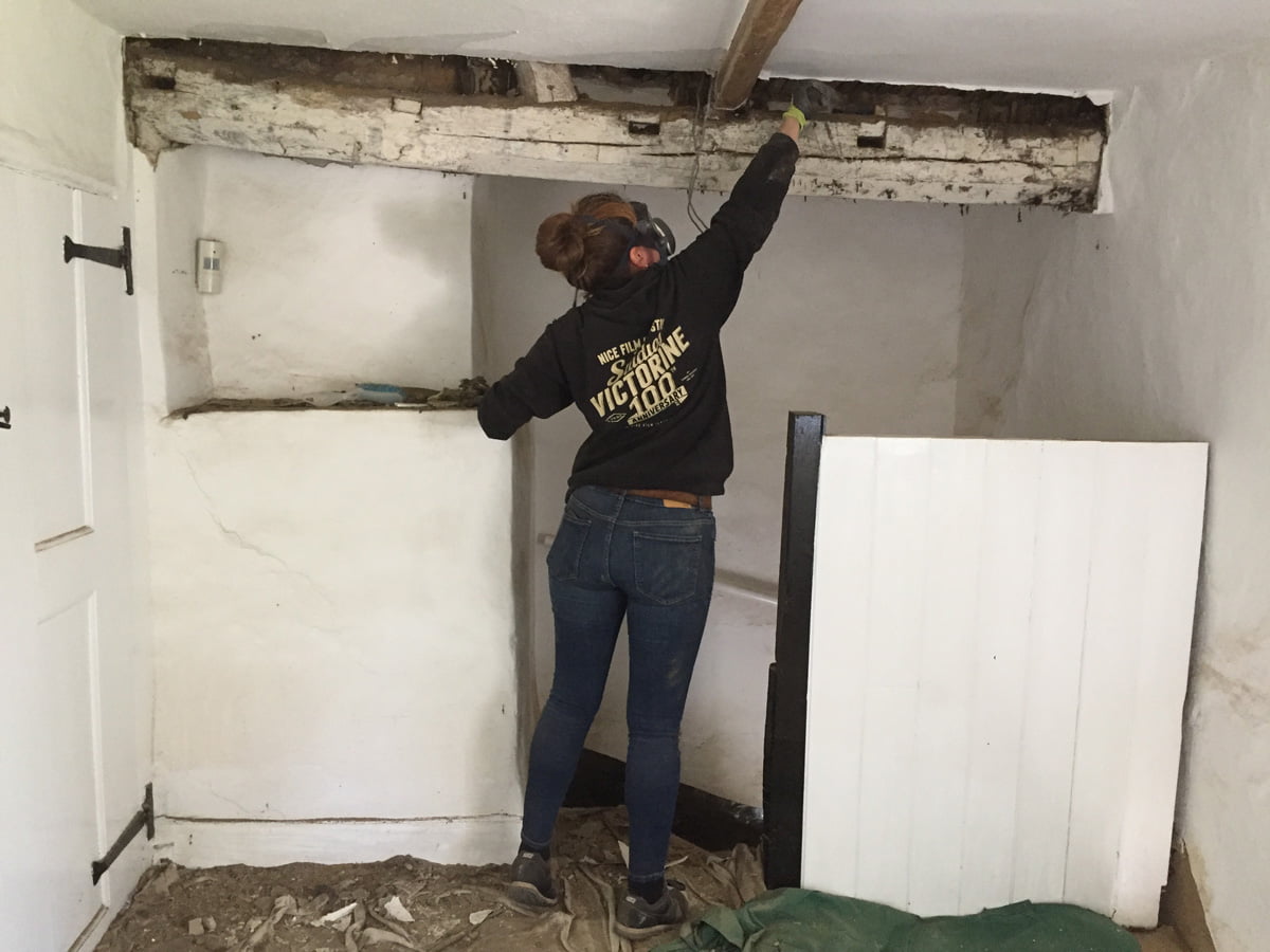 The purpose is to make even more holes in the walls, to uncover any timbers and lintels above windows and doors. We knew there was a big beam at the top of the stairs as we had already made a hole (it had been boxed in many years ago), but we didn’t know how much of a beautiful timber it would be.