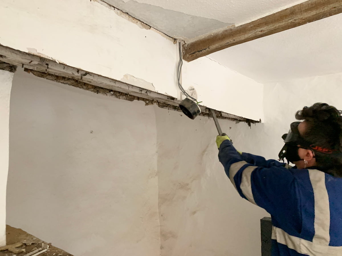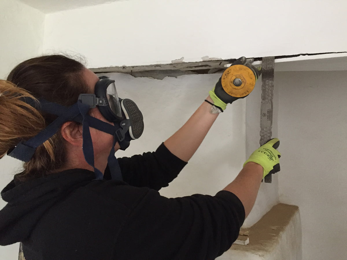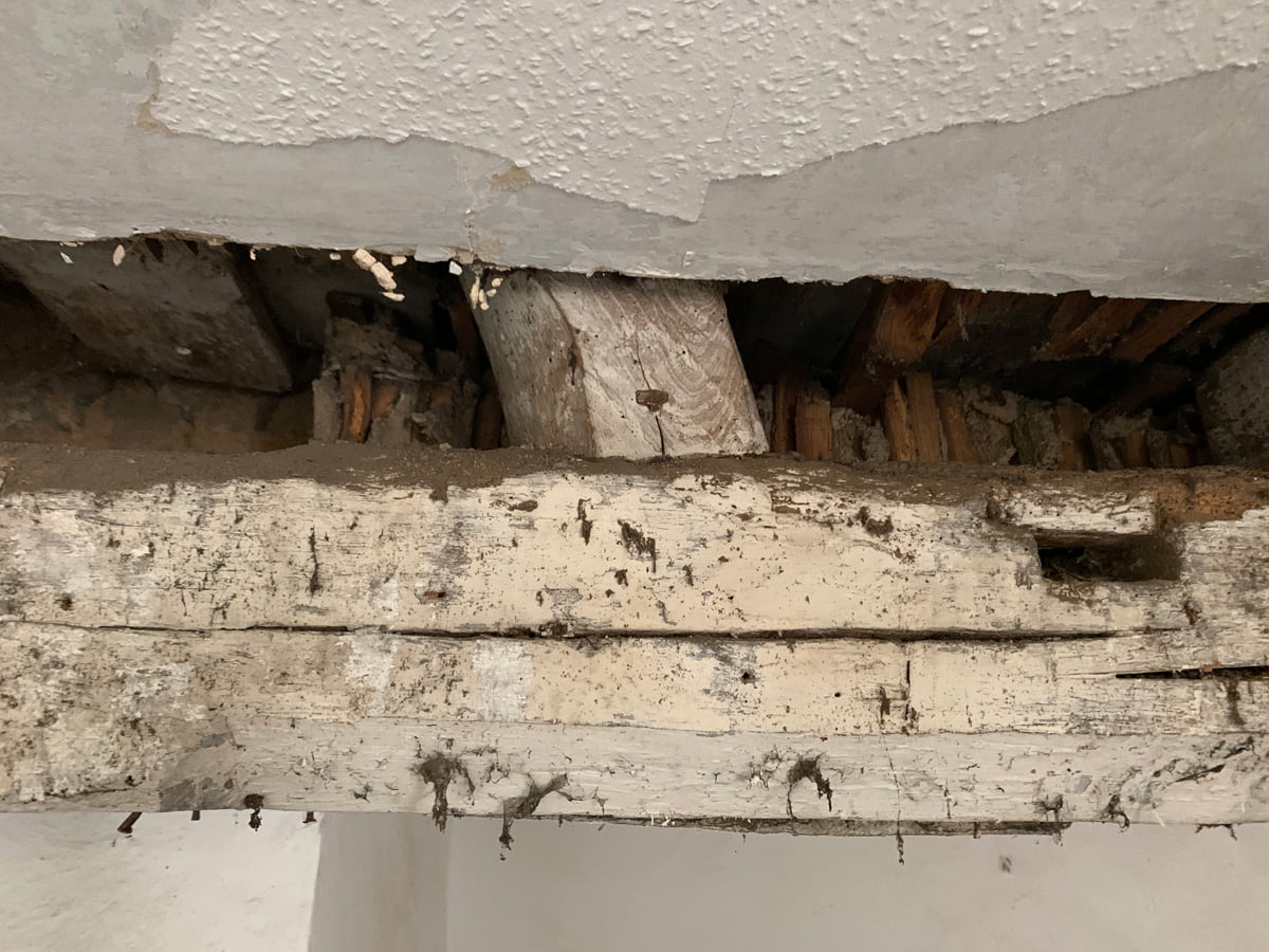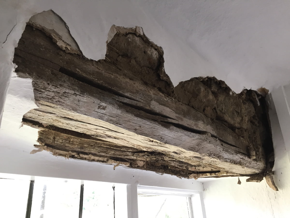 The purpose is to make even more holes in the walls, to uncover any timbers and lintels above windows and doors. We knew there was a big beam at the top of the stairs as we had already made a hole (it had been boxed in many years ago), but we didn’t know how much of a beautiful timber it would be.