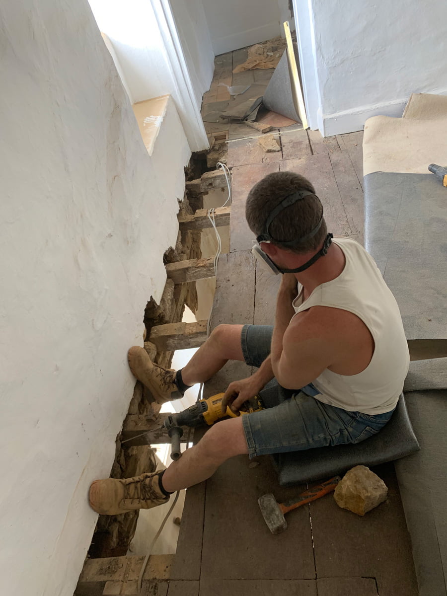 Tom making space to build up the stone around the joists and steels.