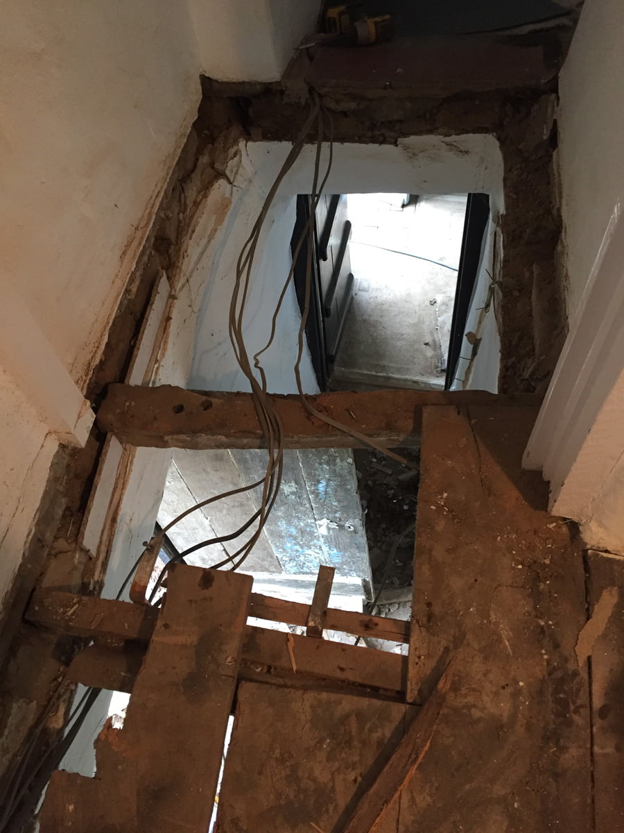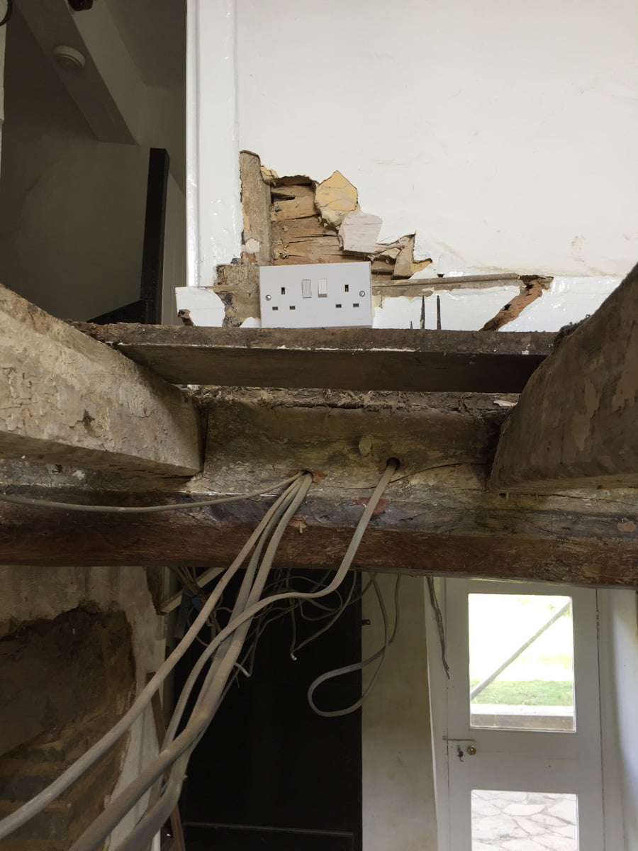 This is the corner between the internal wall between the study and sitting room, at the front of the house where a large crack was visible in the plaster. It appears it might not be tied in with the front and back walls!!! If this is the case, it would explain why the walls have moved out so much… Our structural engineer will take a look at this next week. We may need to add steel brackets at the corners to tie these walls together.