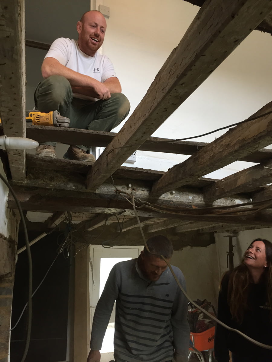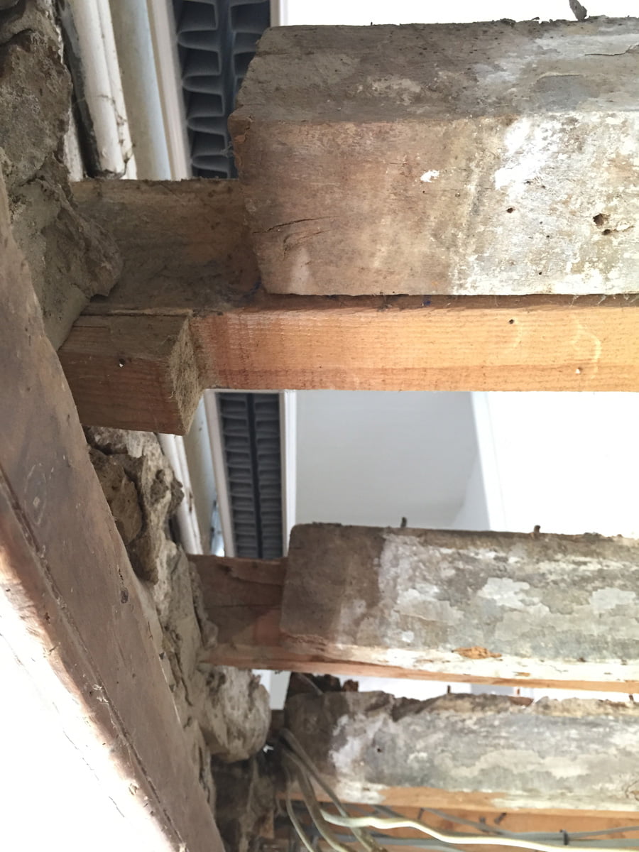 Joist work in the sitting room ceiling progressing. They have moved to the front side of the room where the wall has moved away considerably. This is the more challenging side. The joists are quite a few inches away from the wall here!