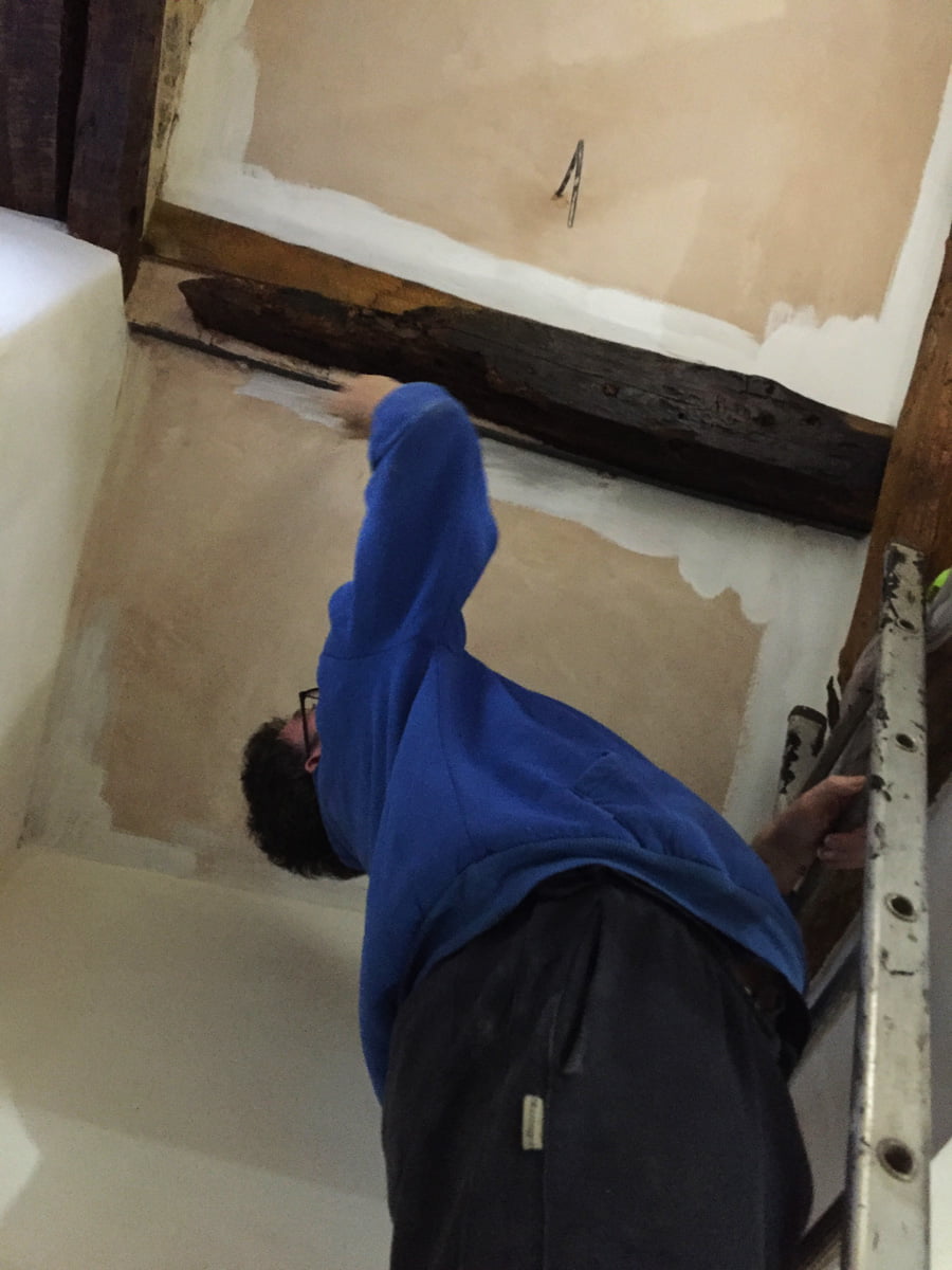Colin is up the ladders again for the weekend, back to help Cat paint the ceilings in the stairwell and landing. There is a lot of cutting in to do in the stairwell as there are so many beams and edges and there are two mist coats to do before two top coats! We have… Continue reading All hands on deck