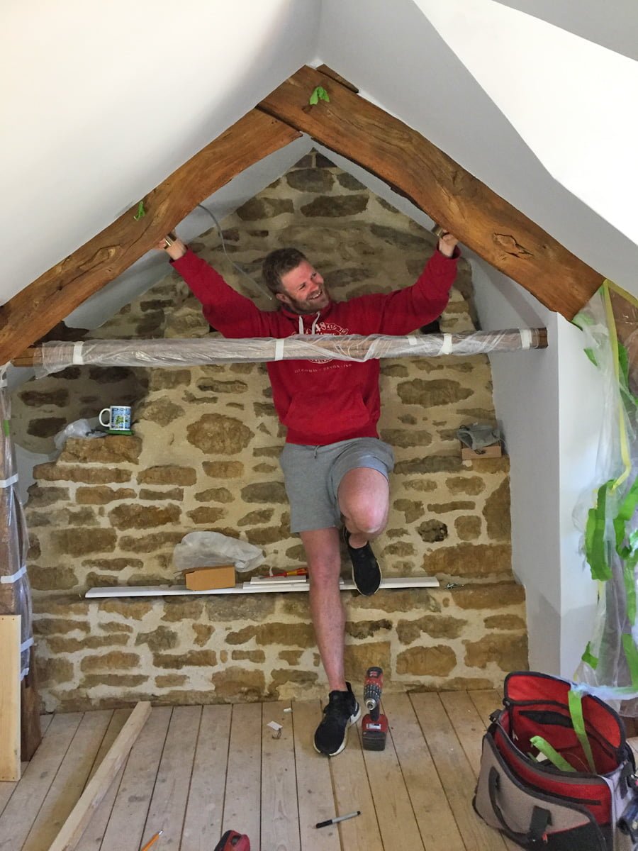 Sam holding the new spotlights in place so we can get them in the right position, but also just realised he looks very like he is being crucified. Very appropriate.