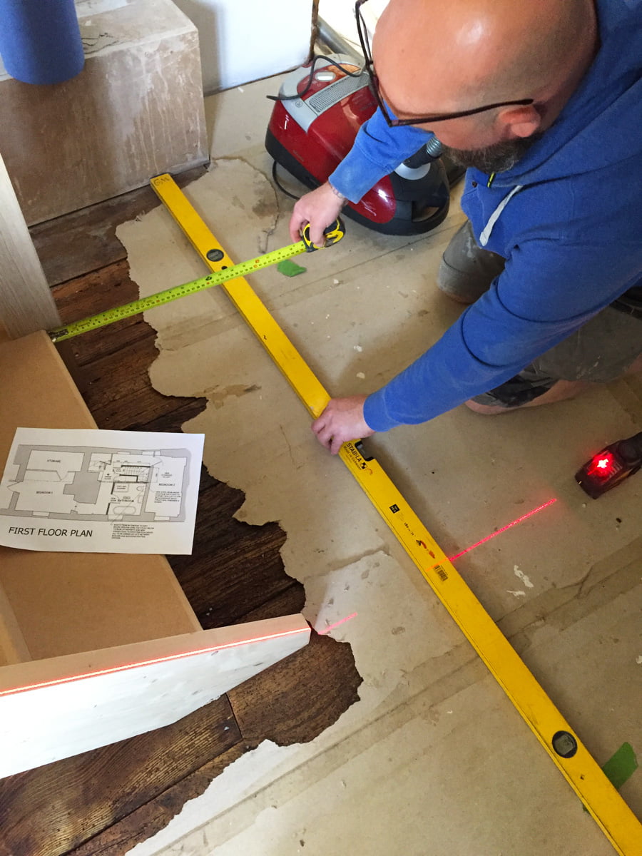 It’s a sunny Saturday morning and Glynn is here to build the stud wall around the attic staircase. As we are within a few mm of tolerance in complying with building regulations, we measure it all very carefully.