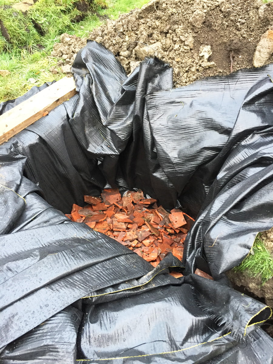 We kept all of our old broken and worn tiles from the roof to use as hardcore for the drains. Here they are being used for drainage in the bottom of the soak away in the back garden. It’s another horrid damp day outside for Tom and George, but inside the windows remain almost completely… Continue reading Ooo shelves!