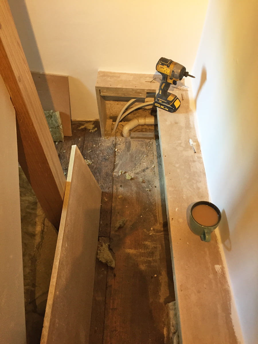 Tuesday morning and our plumber Andy arrives to assess what the hell is going on with the leak in the main soil pipe. The first plan of attack is to go in through the boxing and old floorboards above (under the new staircase), to the area where the waste pipe from the shower, bath and… Continue reading Seven bloody leaks!
